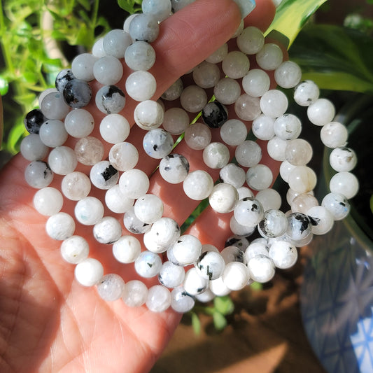 A variety of white labradorite (a feldspar mineral) with a pearly sheen & black tourmaline inclusions. Known for its **adularescence** – a glowing, rainbow-like flash beneath the surface and often found in India, Sri Lanka, Madagascar, and other regions rich in feldspar deposits.
