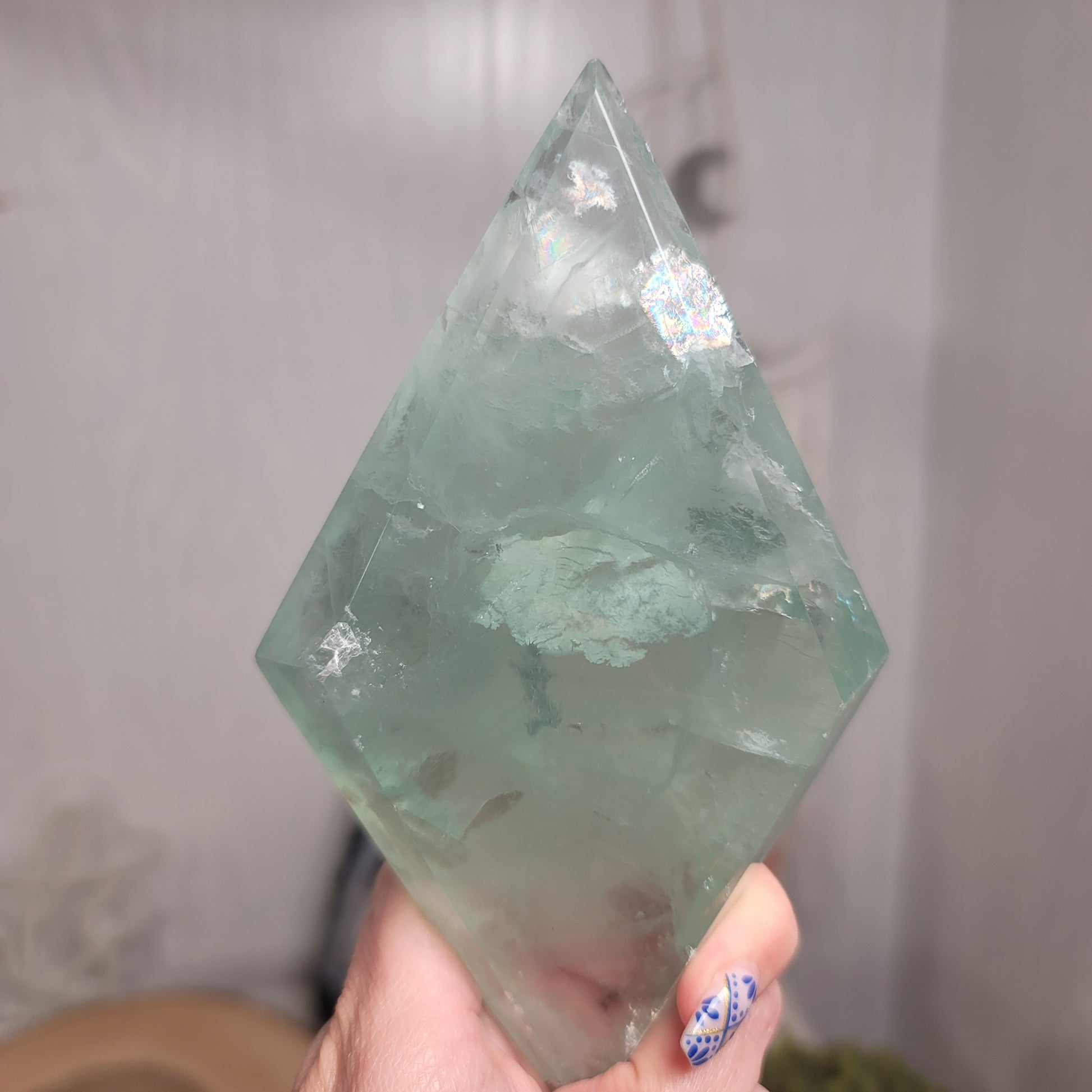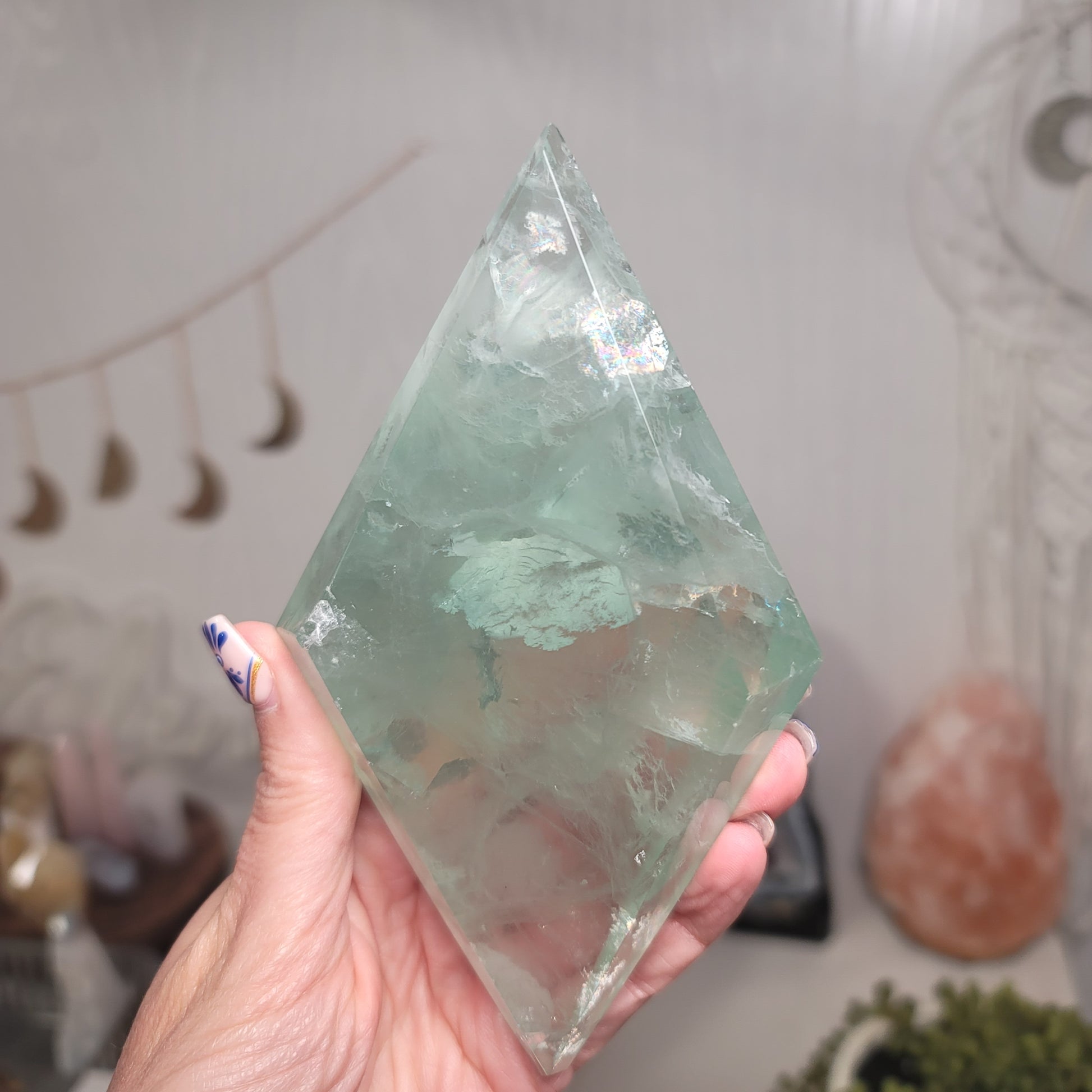 This stunning Green Fluorite Diamond on Gold Stand is a true statement piece—radiant, refined, and full of natural brilliance. Carved into a geometric diamond shape, this high-quality Green Fluorite displays exceptional luster, clarity, and internal rainbows, capturing light beautifully from every angle.