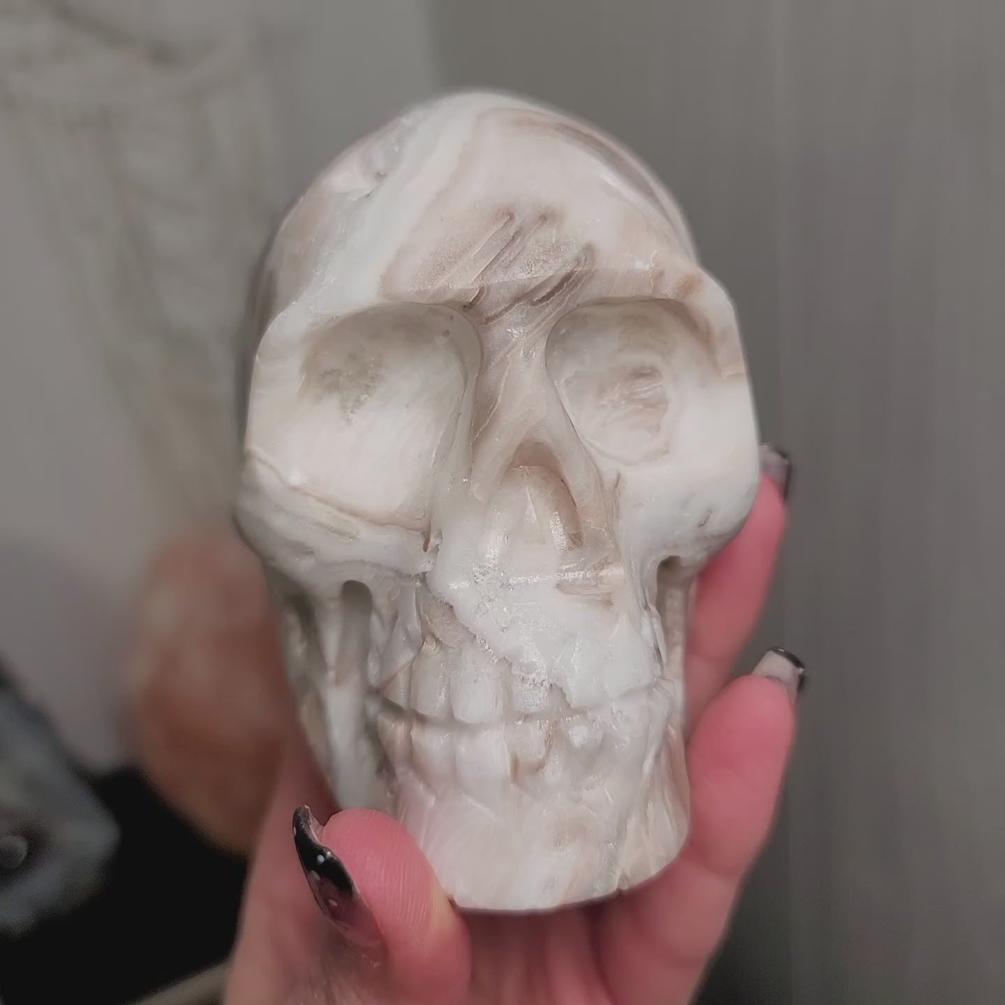 This stunning Banded Calcite Skull from Mexico is a mesmerizing fusion of artistry and natural beauty. Hand-carved with precision, it features flowing bands of cream, brown, and charcoal tones that ripple across the surface, revealing the unique energy and character of the stone.